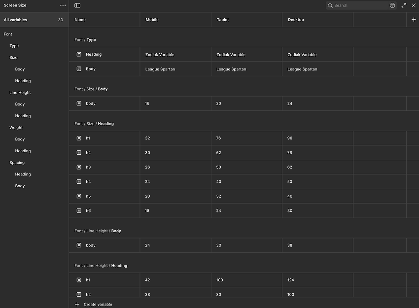 After some sketching, it was time to develop the brand identity. The goal of the project is to have a fully responsive site, and using typographic scaling and semantic color values is the easiest way to achieve this. After determining the typeface and color palatte of the site, I turned to using the variables panel within the Figma space. I created a primitives panel for color and numerical values, a semantic color panel for color states, tokens for specific usages within the designs, and a screen size panel for the automatic updating of typographic values based on the size of the frame.